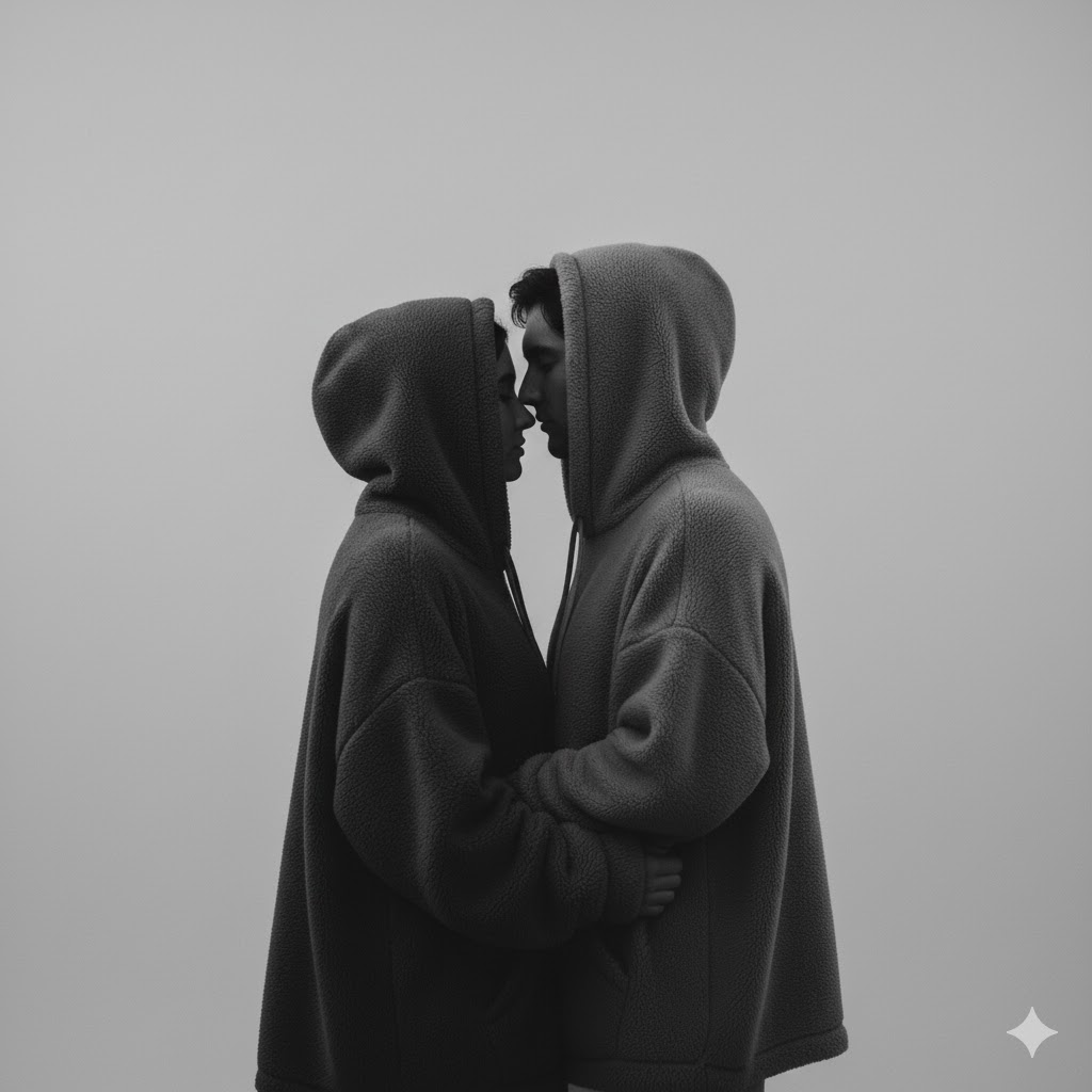 Minimalist couple fashion portrait, matching gray hoodies, soft lighting, clean background, 8K realism